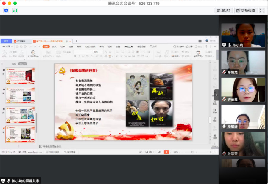 四个党小组以团队合作的方式朗读了多样的作品。第一党小组刚强有力地朗读了《同心战“疫”》,表达了中国人民坚决打赢疫情防控保卫战的决心;第二党小组与大家一同赏析了青年诗人《长安有妙笔》,字里行间感情基调跌宕起伏,让人读来热血沸腾;第三党小组动人地朗读了《致敬抗“疫”英雄》,讲述了那一个个被广为传颂的抗疫故事,读书了那故事中的温暖和希望。第四党小组的党员同志柔情地朗诵了《母亲是一种岁月》,读出了母亲那深刻的爱。各党小组朗读分享后,各位党员纷纷踊跃分享心得体会。蔡文蝶同学表示:特别的线上主题党日活动,缩短了四个多月未见的距离,大家依然熟悉。线上读书听书,分享感悟,也是集体学习的最佳途径。叶梓芸认为:每一次主题党日活动都有新的体会,即使大家都是不同的地方,线上组织人员、排练都是有困难的,但是一起克服困难完成分享活动,大家在不同的地方,读着同一本书,也是一段特别的经历。