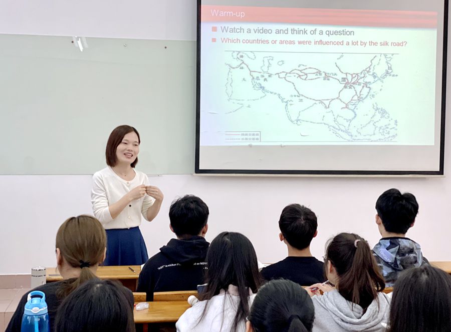 本场研讨课为18级英语专业课程“中国文化概论(英语)”,主讲老师为毛文秀老师,讲课主题为 “中国丝绸之路”。毛老师在课程开始时先向学生简要概述了本课教学目标和教学内容,接着用一段视频,引出本次课程的主要内容——“丝绸之路”。 毛老师先是让同学们快速阅读课文内容,再结合视频,采用问题引导的方法,逐步引导学生了解古代和现代关于丝绸之路对中国乃至世界的影响,并理解中国政府提出“一带一路”倡议的战略意义和文化意义。毛老师全程用英语进行讲授,教态自然,语速平稳,课程设计流畅,教学环节紧凑,教学内容丰富,教学效果良好。