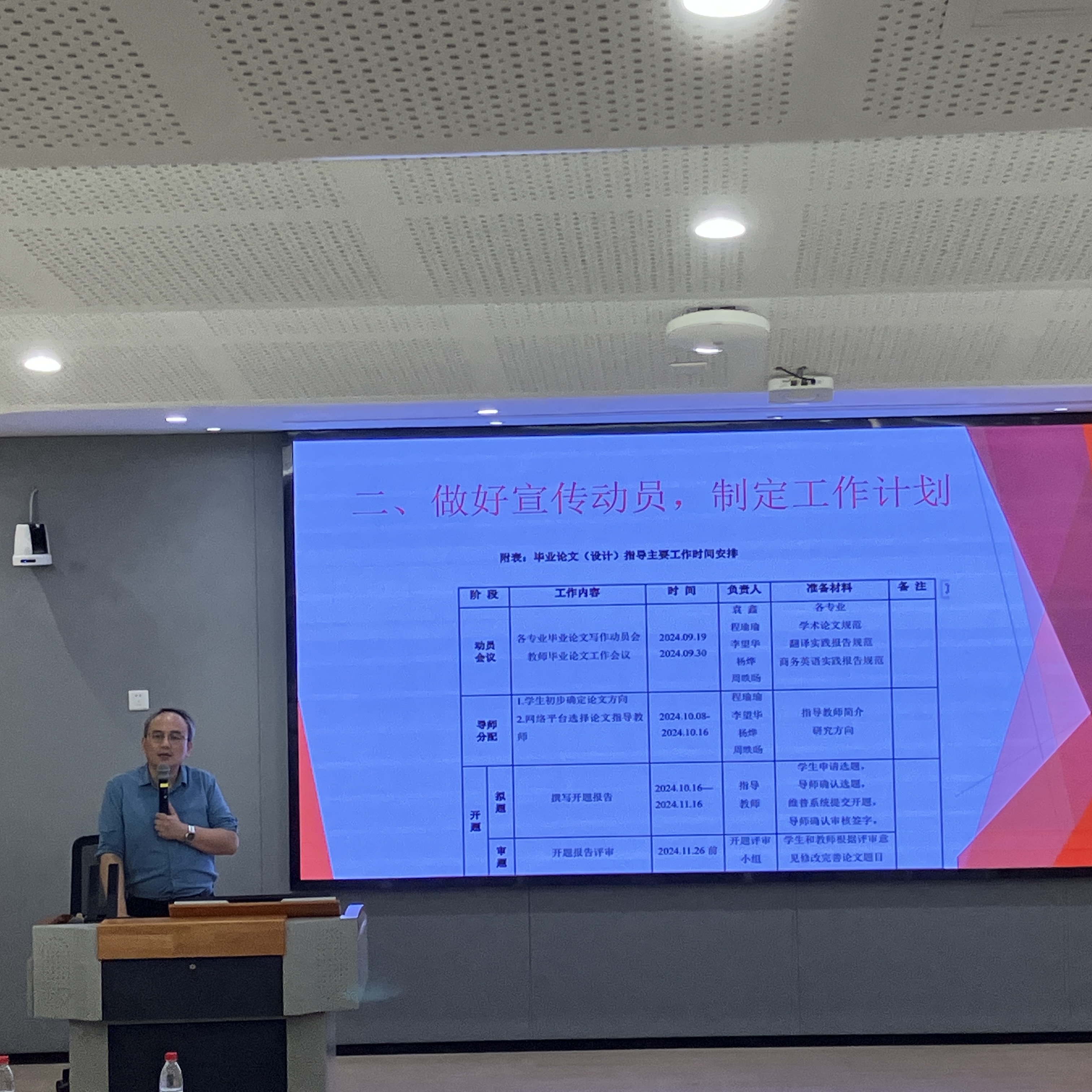 9月26日,为了更全面地覆盖即将步入毕业论文撰写与毕业实习阶段的毕业生,特别是考虑到部分同学已在校外进行实习,必赢官网在教学楼八教103创新性地采取了现场与线上直播相结合的方式,成功举办了2025届毕业论文毕业实习动员大会。此次会议不仅确保了留校学生能够直接参与、实时互动,也让校外实习的同学们能够跨越地域限制,同步获取重要信息与指导。会议由必赢242net官网副院长袁鑫、商务英语系主任李望华、英语专业系主任程瑜瑜、德语专业系主任周昳旸以及教务员杨超参加会议,各会议专场由各系主任主持。