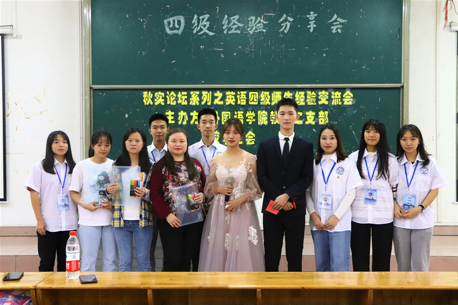 在一教111教室举办了“秋实讲坛”之大学英语四级考试经验交流会。本次交流会由学院教工第二党支部书记潘文晗老师主讲,同时特邀两位优秀学生刘素芬、李冰冰参加。