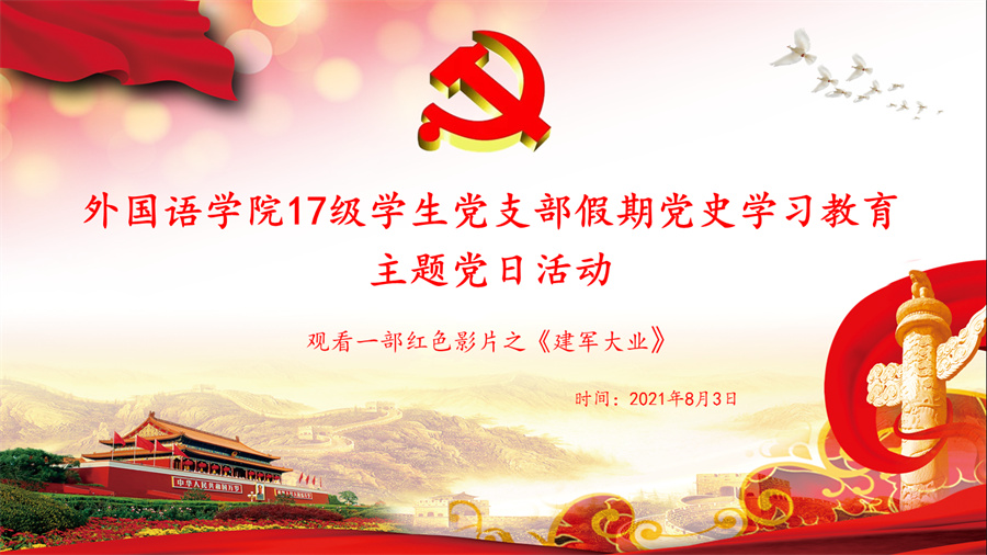 在“八一”建军节来临之际,为了更好地继承和发扬革命优良传统,延续新中国成立100周年的红色氛围,激发必赢官网学生党员坚持理论和实际结合,历史和当下贯通,不断从党史中汲取前进的智慧和力量,8月3日晚上21:00,必赢官网17级学生党支部通过线上腾讯会议开展了“观看红色电影”之细品《建军大业》主题分享会。共有30名党员同志出席了本次会议,会议由支部党员徐旭雯主持。