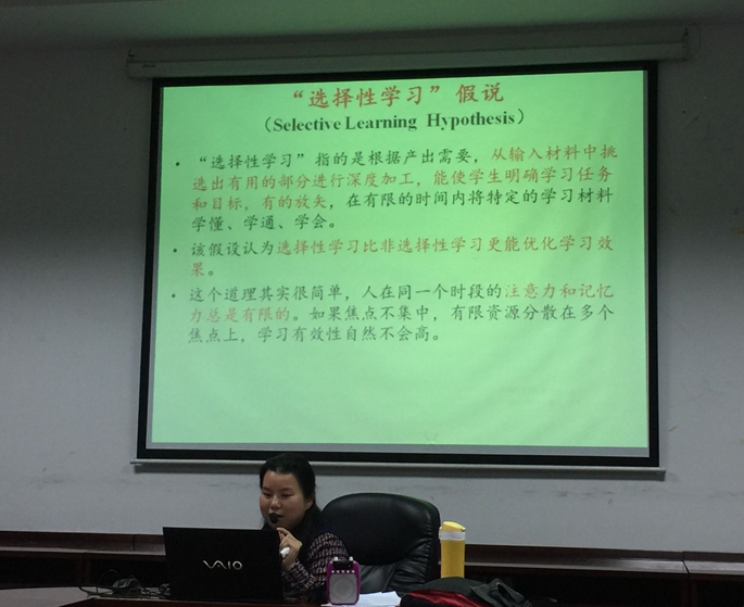 伍老师继而结合自身教学经验和科研成果,阐述其在运用自己的模式进行教学的经验,然后详细讲解文秋芳教授的“产出导向教学体系”和前沿发展,并提出了自己的理解。