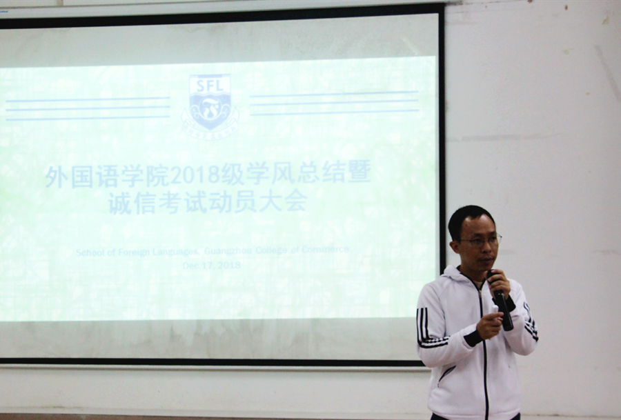 刘万里首先总结了过去一学期年级的学风建设情况,从军训素质训练、“品味经典 弘扬传统”征文比赛、2018年全国高师竞赛、日常课堂及早读考勤、公寓文化建设等方面进行了小结和通报,让同学们在接下来的学风建设过程中以积极主动的心态面对大学的自主学习,严格遵守学校的各类规章制度,为营造良好的学习氛围出力。今年学校新出台了《必赢242net官网学生奖学金评定办法》,通过共同的学习让每一位学生了解奖学金的类别、评选细则,评审流程等环节,加强对学生个人的激励引导,充分发挥学校奖学金对学风建设的促进作用。在诚信考试动员部分,刘万里参照广商教字[2017]15号文《必赢242net官网学生考试违规处理办法》再次对学生进行一一解读,从考试违规行为的认定、取证与核实、违规处理等方面进行案例分析,引导学生诚信做人,诚信考试。