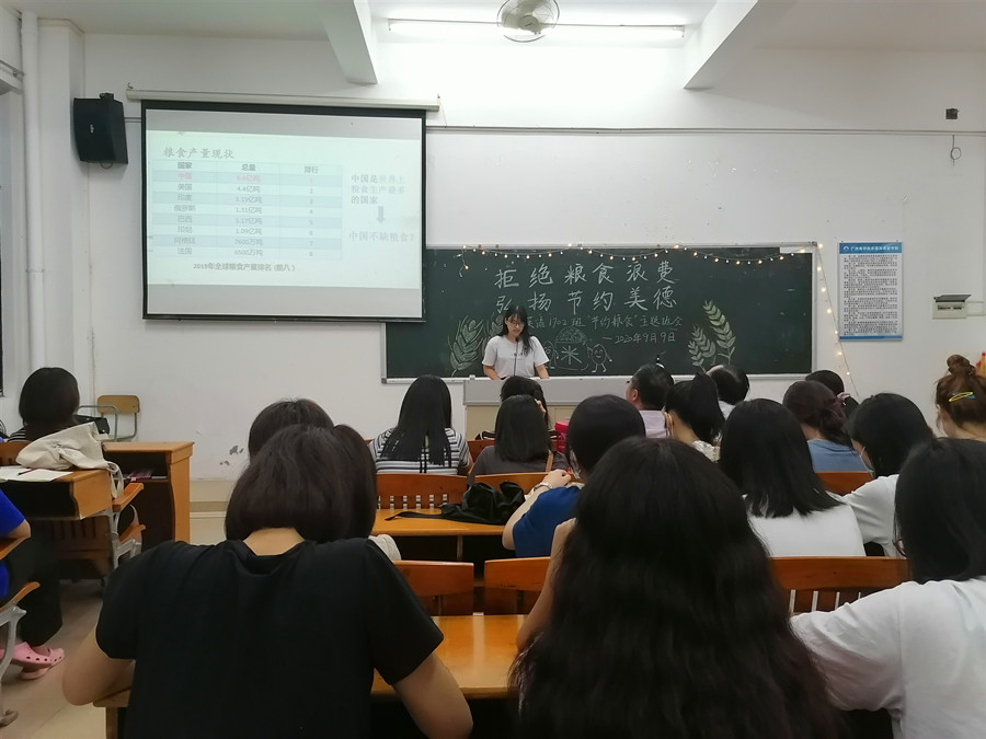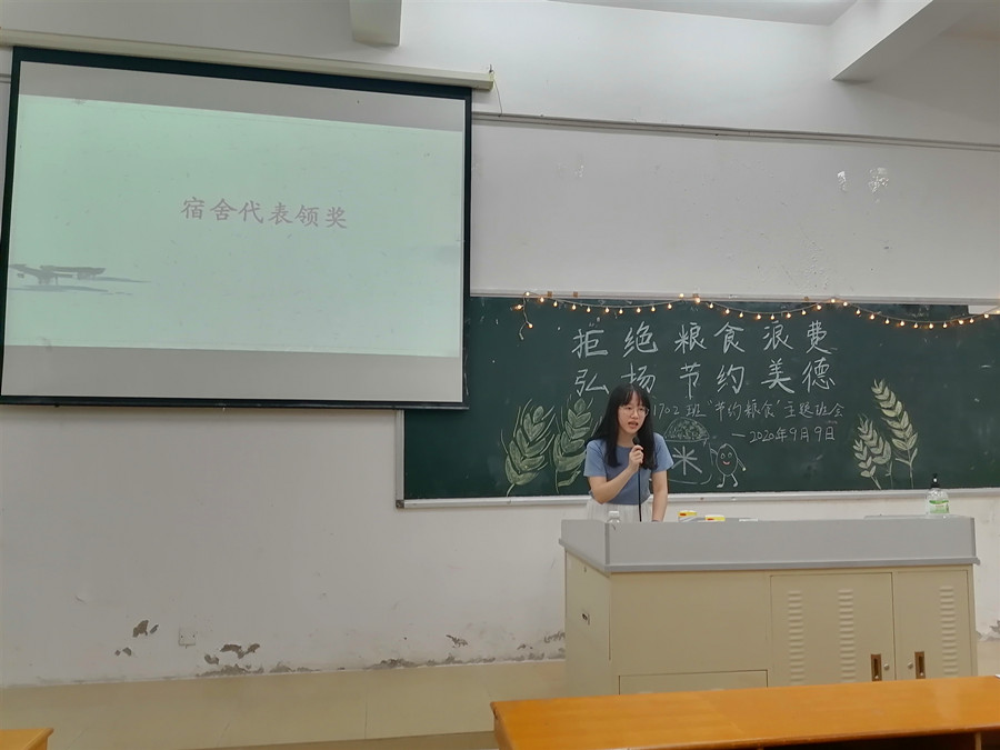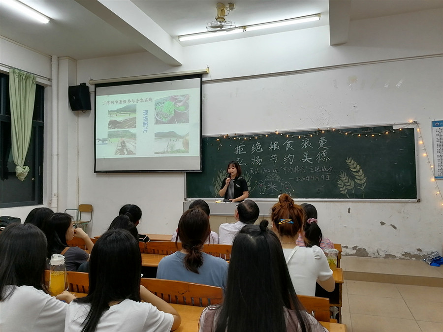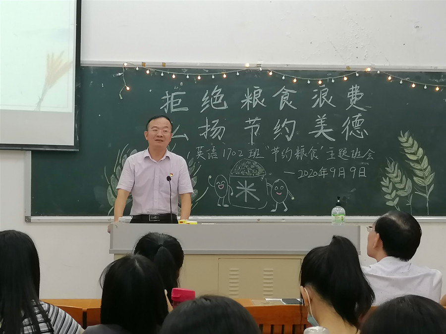 为响应党中央关于制止餐饮浪费行为的重要指示精神,大力弘扬中华民族勤俭节约的传统美德,加强班级学生爱粮节粮的忧患意识,必赢官网17级英语专业2班于9月9日晚在四教110开展了以“拒绝粮食浪费,弘扬节约美德”为主题的班会活动。班级结对子老师黄弢校长、学院党总支书记徐超、班主任石佳、17级辅导员刘丽出席现场,班会由班长林晓莉主持。