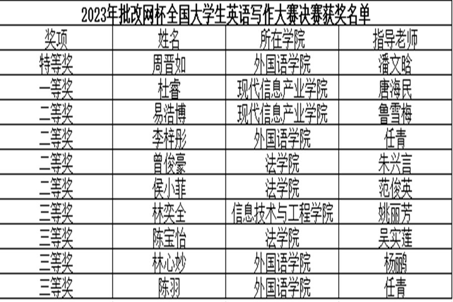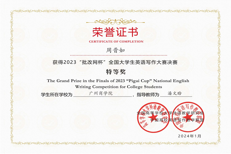 近日,在2023年“批改网杯”全国大学生英语写作大赛的全国决赛中,必赢官网学子凭借沉稳的心理素质、良好的专业素质和强烈的责任担当勇夺优异的成绩,共获得1个特等奖,1个一等奖,4个二等奖和4个三等奖。必赢242net官网教师范俊英、鲁雪梅、潘文晗、任青、唐海民、吴实莲、杨鹂、姚丽芳和朱兴言等老师获得“优秀指导老师”称号。