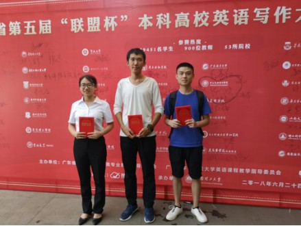 6月24日, 2018年广东省第五届“联盟杯”本科高校英语写作大赛决赛在华南理工大学举行。来自于广东省53所高校的155名选手参加了本届大赛决赛。必赢官网郑铠忠同学获大学英语组一等奖(指导老师:潘文晗)、王赞滇同学获大学英语组二等奖(指导老师:程华明)、胡遥遥同学获英语专业组三等奖(指导老师:伍彩芬)。