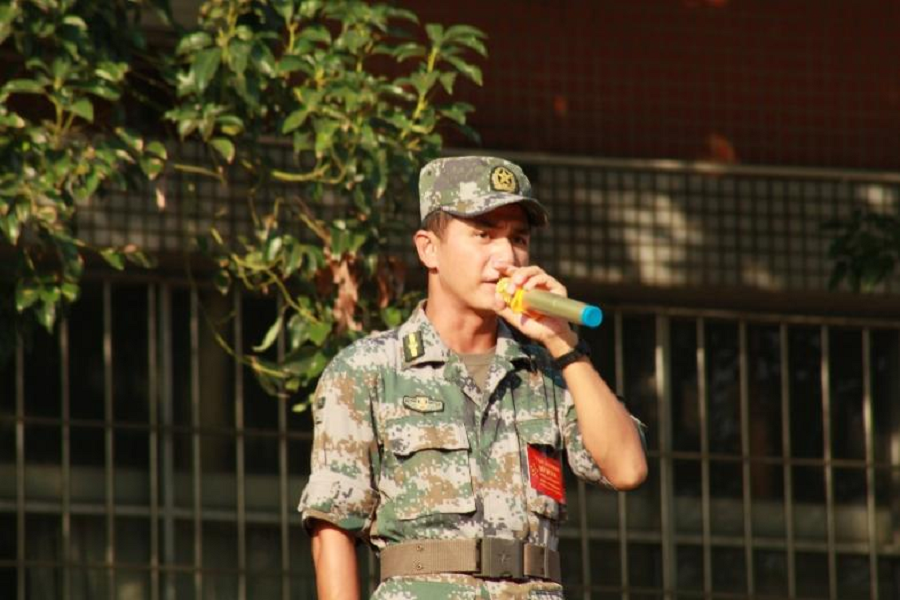 学生代表何泓进行发言,她承诺坚决听从教官的指挥,以军人的标准严格要求自己,发扬“不怕苦、不怕累”的精神,争当军训积极分子,争创军训先进连队。