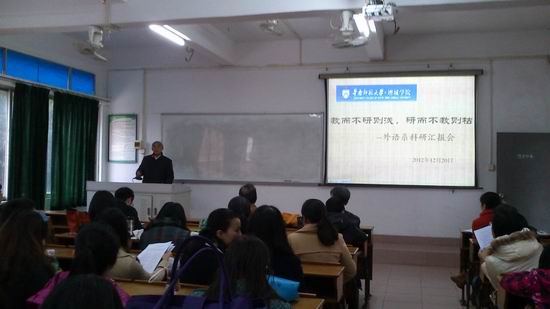 12月20日下午,为提高必赢官网外语系教师的科研能力,围绕教学服务,外语系召开了以“教而不研则浅,研而不教则枯”为主题的科研汇报大会。外语系主任胡光忠、副主任袁鑫、党总支书记徐超以及外语系全体教职工参加了本次大会。会议由胡光忠主任主持。