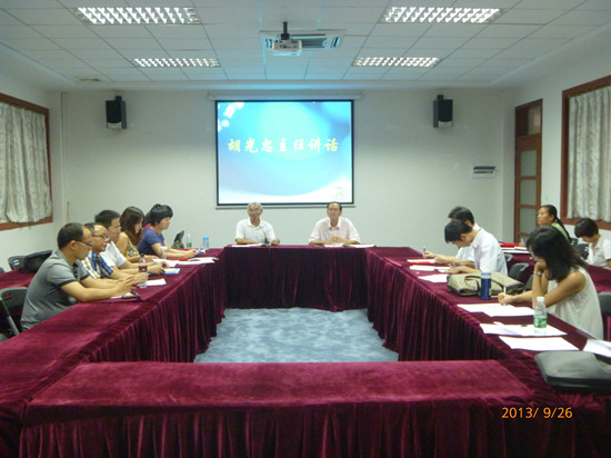 最后,主任胡光忠发表讲话,对2013级学生导师工作提出三点要求:一是以加强班风和学风建设为工作重点,进一步明确导师工作的责任;二是以信息环境建设为辅助手段,与学生建立亦师亦友的良好关系;三是以培养学生综合素质为工作目标,提高学生思想道德水平和培养学生独立思考的能力。