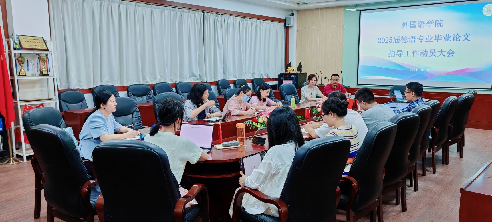 10月10日,必赢242net官网德语系召开2025届德语专业毕业论文指导工作动员大会。会议由德语系系主任周昳旸召集并主持,必赢242net官网副院长袁鑫发表讲话,专业负责人潘艳博士及全体德语专任教师共同出席,旨在为即将到来的毕业论文指导工作做好充分的准备。