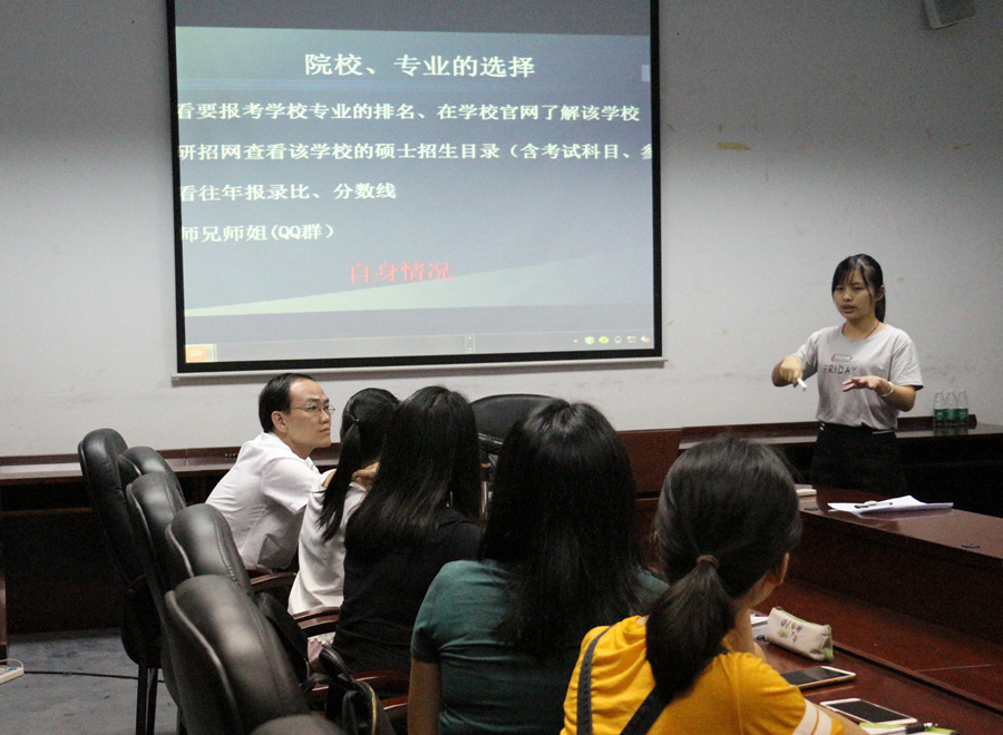 为了延续良好的考研风,必赢官网在今年三月举行了“SFL生涯辅导工作坊”的2018届毕业生考研动员活动,在5月5日下午在第二行政楼308召开考研专题的第二场:考研经验交流会。学院党总支书记徐超、13级辅导员雷肖茹、14级辅导员刘万里、14级意向考研学生共30余人出席了交流会;本次交流会由3位优秀考研代表讲授考研经验及心得,分别是成功考入华南师范大学的吴佩珍,江西师范大学的杨梦环和广州大学的阮泳仪。