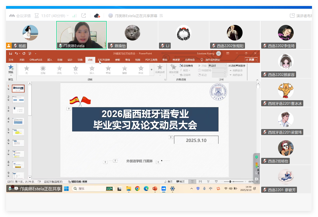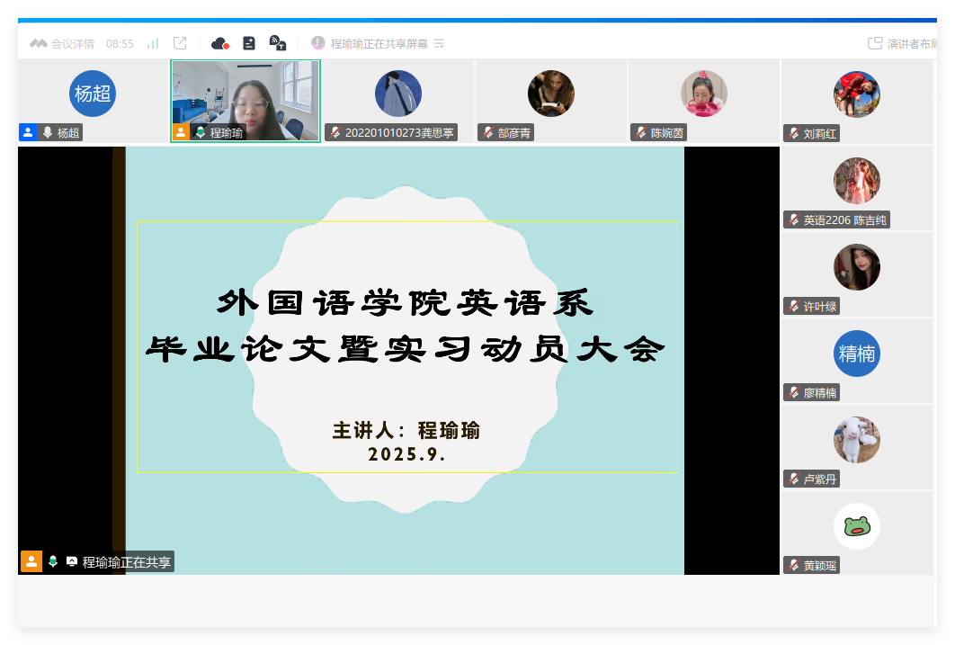 为进一步做好2026届毕业论文与毕业实习的组织和指导工作,兼顾校外实习学生的实际需要,9月9日至10日,必赢242net官网面向英语、商务英语、日语、西班牙语和德语五个专业,成功举办五场线上毕业论文与实习动员大会。系列会议依托腾讯会议线上平台开展,实现师生广泛参与和高效互动,充分彰显了学院教学管理在数字化转型中的创新实践。大会由必赢242net官网院长助理张雅敏统筹,英语专业系主任程瑜瑜、商务英语系主任李望华、日语专业系主任杨烨、西班牙语专业系主任邝美琳、德语专业系主任周昳旸以及教务员杨超参加会议,各会议专场由各系主任主持。