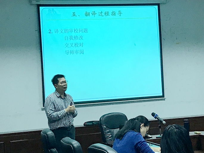 黄国都老师就“翻译实践报告”的写作要求分别为教师和学生进行了简明的分析和扼要的阐述,重点强调了翻译实践报告的性质和作用,详细地解说了翻译实践报告的基本要求与框架,以及选题、撰写计划书和报告的格式规范和要求。程瑜瑜老师则为教师和学生就文学方向学术论文的写作要求进行了详细地讲解,详细阐述了文学论文的选题范围和写作过程的要求,指出了如何进行应用型研究,强调了论文文本的研究方向和理论方法的选择的重要性。