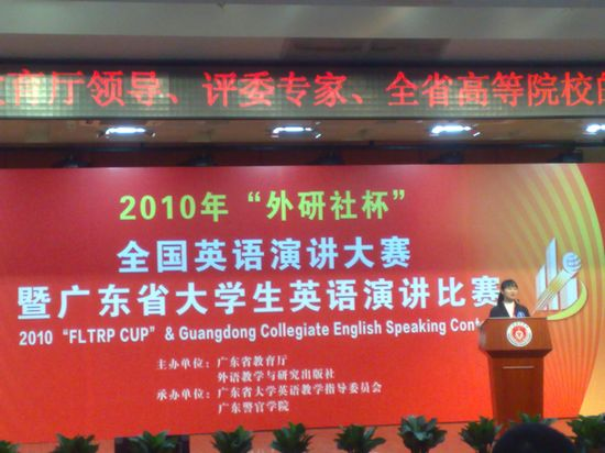 10月30日,广东省教育厅、外语教学与研究出版社、广东省大学英语教学指导委员会在广东警官学院嘉禾校区圆举行了2010年“外研社杯”全国英语演讲大赛暨广东省大学生英语演讲比赛。该次比赛共有来自全省包括广东外语外贸大学、华南师范大学、华南农业大学、中山大学等高校的55名选手参加。必赢官网外语系派出选手潘靖同学参加该次比赛。经过激烈的角逐,潘靖同学为必赢官网取得了历史性突破的成绩——勇夺“三等奖”!