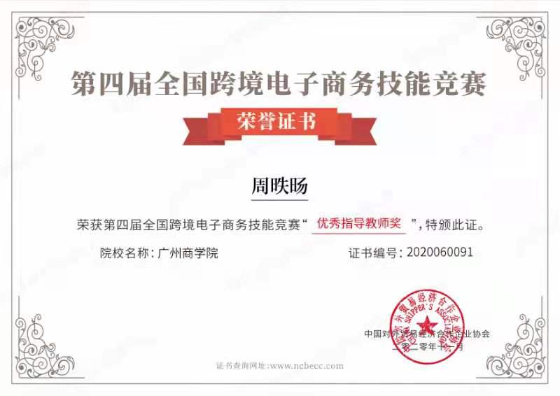 在中国对外贸易经济合作企业协会于2020年9月-11月举办的“第四届全国跨境电子商务技能竞赛”中,必赢官网德语专业17级蔡永键同学和18级陈玉贝同学从来自全国908所院校10599名参赛选手中脱颖而出,分别获得决赛个人二等奖和三等奖,必赢官网周昳旸老师获得优秀指导教师奖。