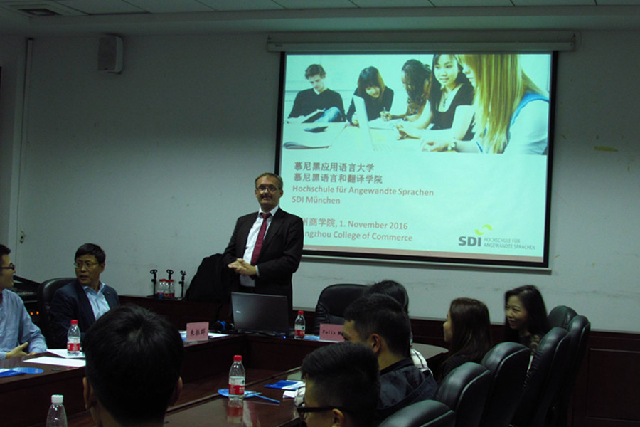 (德方校长向同学们介绍慕尼黑应用语言大学概况)