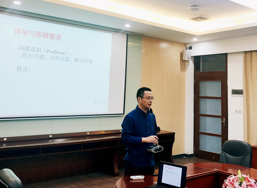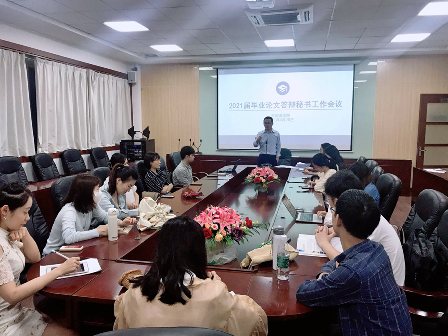 4月29日下午,全院毕业论文答辩工作会议上,袁鑫副院长在总体上做了工作部署,向各位老师们介绍了2021届毕业生的基本情况、答辩分组情况和答辩时间安排。袁鑫副院长指出问题意识和语言水平是评审和答辩老师把握的核心,并对今年使用的各个毕业论文评审和答辩标准进行的讲解,最后就毕业论文评审和答辩的工作规范做了进一步说明。会议最后邀请英语系张蕾老师进行了经验分享,张蕾老师指出英语类翻译实践报告评审要严格按照学院评分标准,把握主要原则,重点评估学生的问题意识,要求学生能总结实践中遇到的主要难点,能对难点进行明确定义,分析有理有据,逻辑清晰,层次分明。