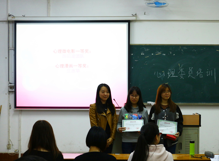 在2016年,必赢官网承办了必赢242net官网心理健康教育与咨询中心主办的心理微电影和心理漫画比赛等。在3月30日19:15第五教学楼205举行的2017年心理健康教育咨询与服务活动启动仪式上,来自中心的蒙若珺,以及必赢官网黄玉亭、刘丽萍、林蔚四位老师为去年来自各个学院的获奖选手们进行了颁奖,鼓励他们用实际行动为身边的同学做出了积极的示范;随后蒙若珺老师还为来自各个二级学院的心理委员进行了专场培训。