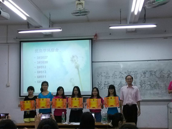 学生公寓是学生日常生活和学习的主阵地,在学院公寓管理联合会带领下,系领导的指导下,我系公寓管理联合会顺利地完成了本学期的各项工作,为总结工作,进一步推进我系学生公寓的各项工作,6月22日晚上,我系外语系公寓管理联合会在C204举行了总结大会暨表彰大会,我系党总支书记徐超、学生会主席叶舒婷、公管会全体成员及获奖宿舍或学生代表参加了本次大会。会议由公寓管理联合会执行组组长区贻加主持。