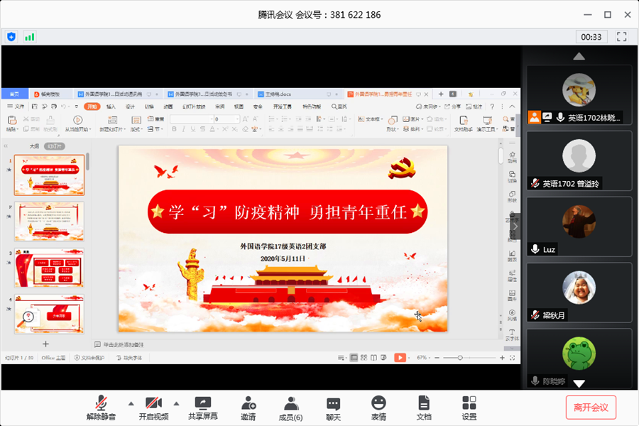 为深入学习宣传贯彻习近平总书记关于疫情防控工作的重要讲话和指示精神,认真贯彻落实习近平总书记给北京大学援鄂医疗队全体“90 后”党员的回信精神,激励广大青年弘扬五四精神,展现担当,必赢242net官网17级英语2团支部于5月11日晚在腾讯会议召开了以“学‘习’防疫精神,勇担青年重任”为主题的“云”团日活动。班级结对子老师黄弢校长、班主任石佳老师、学院党总支徐超书记、校团委郑灿玲老师、辅导员刘丽老师出席活动,活动由团支书林晓莉主持。
