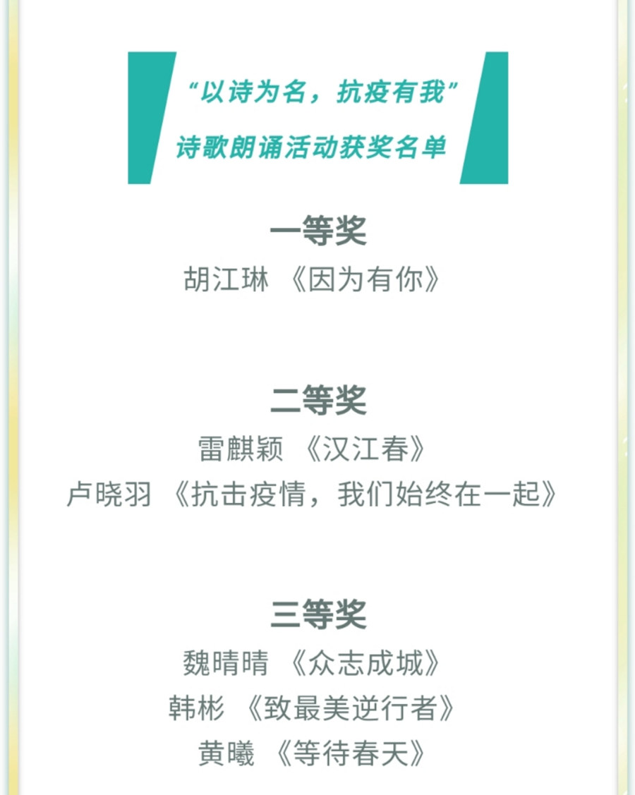 疫情面前,人人有责。本次活动,不仅鼓励了同学们以积极向上的精神面貌参与到疫情防控工作中,为抗疫行动加油助威,也丰富了同学们的居家生活,为同学们搭建了展示自我才华的线上平台,大家以铿锵有力的声音,饱含深情的朗读,表达对抗疫英雄的赞美与敬意,展示出必赢官网学子共同抗疫的坚定信心。