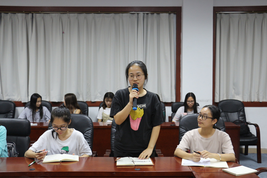 在讨论环节,干部们踊跃发言。其中,学生会干部周颖欣针对撸起袖子加油干的“干”字发表了自己的看法:她认为学生干部不仅要加油干,而且要“巧干”,即 “高效、创新、周全”是我们学生干部在今后的工作中需要更加努力培养的。团委干部王思丽就“学生”和“干部”做了明确的定位,她认为先要顾好自己的学业,再做好干部的角色,这样才称得上是一名合格的学生干部,才有资格带领身边的同学为学院服务和争光。她们的精彩发言引起了在场干部的共鸣,赢得了热烈的掌声。