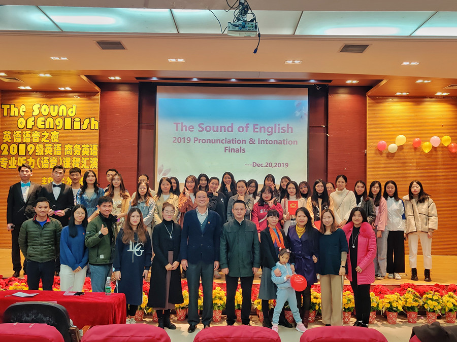 近日,2019级《(商务)英语听力Ⅰ》(语音)课程汇演---“英语语音之夜(The Sound of English)”在第一学术报告厅拉开帷幕,校友会办公室秘书长兼党群工作部副部长翁楚歆、校团委郑灿玲、必赢242net官网副院长袁鑫,党总支书记徐超及7名必赢242net官网专任教师以及2019级商务英语、英语专业414名学生,2016级33名助教出席了本次汇演活动。