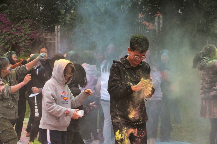 在热烈的掌声中,徐超与领跑学生代表进行院旗交接仪式。伴随彩色礼炮的响起,彩跑正式开跑。同学们依次冲过了起跑线,快乐地向前奔跑,共同领略四季的变换。