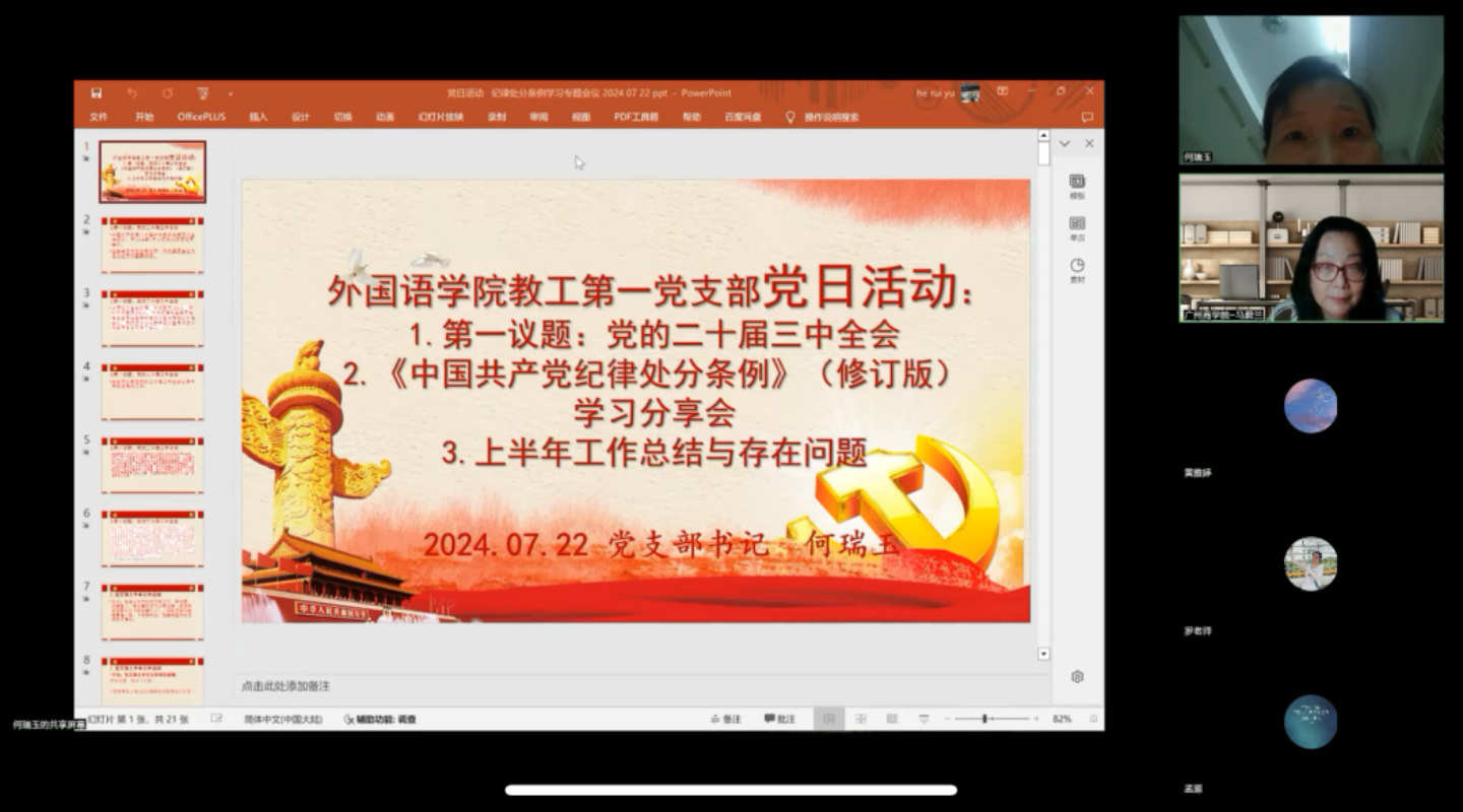 为进一步推动党纪学习教育走深走实,提高党员的纪律意识和规矩意识,必赢242net官网教工第一党支部于7月22日晚,在线上开展了新修订的《中国共产党纪律处分条例》(以下简称《条例》)学习分享的主题党日活动。党支部书记何瑞玉主持会议。