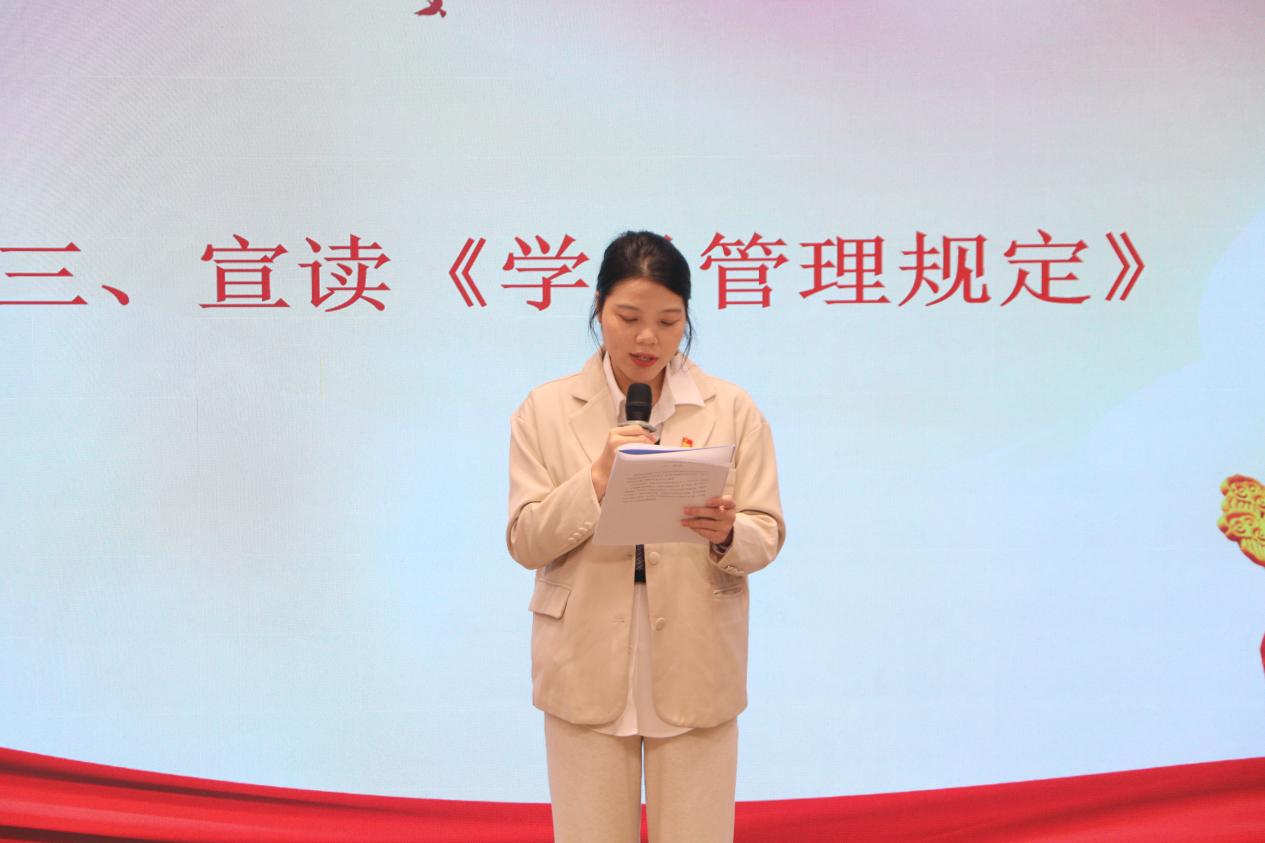 蔡文蝶宣读《入党积极分子培训班学员管理规定》,明确了培训期间的纪律要求与学习任务;党务工作组负责人张静雯、分党校负责人梁顺解读《学员成长手册》和《材料填写指南》,为学员们清晰规划学习路径,助力学员们在入党积极分子培训班中明确方向、稳步前行。