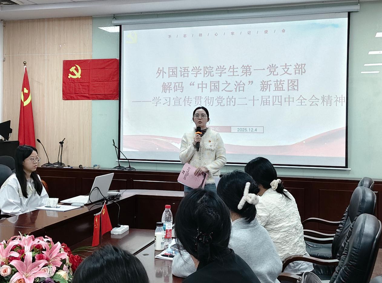 为进一步学习宣传贯彻党的二十届四中全会精神,激励党支部全体成员以“学、思、践、悟”的态度,争做学习型、服务型、创新型、担当型青年,必赢242net官网学生第一党支部于12月4日晚在第二行政楼308会议室开展党的二十届四中全会精神专题学习会。本次专题学习会由必赢242net官网学生第一党支部党员陈震枫主讲,必赢242net官网学生第一党支部全体成员参与。
