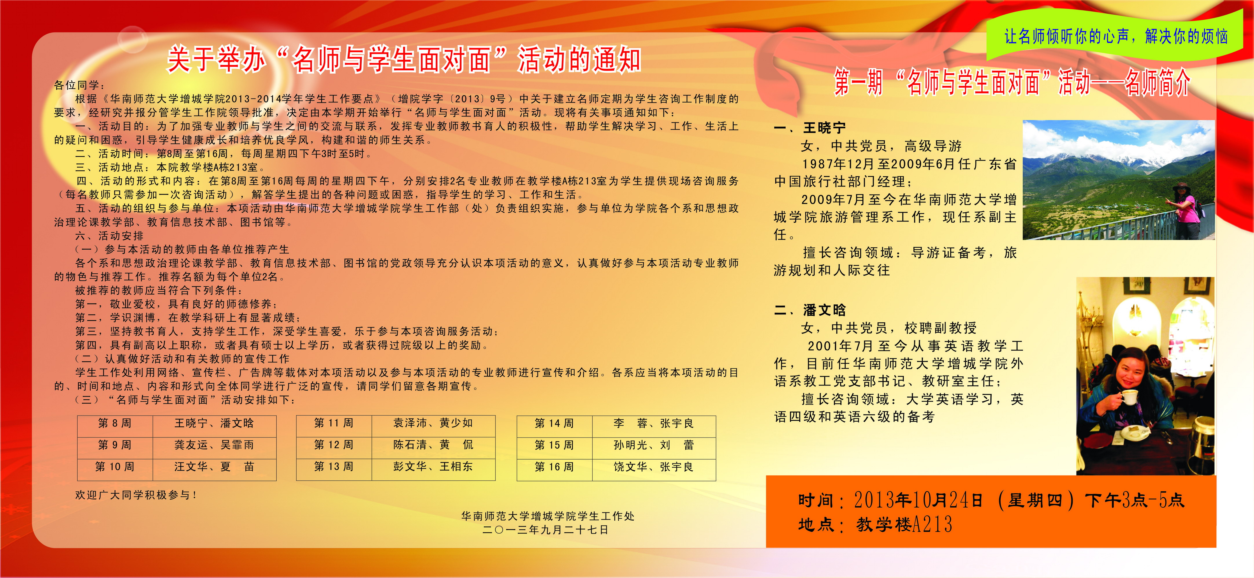 本学期“名师与学生面对面”第一期活动将于2013年10月24日(本周四)下午3时至5时于教学楼A213举行,请各系、各单位做好宣传工作,欢迎各位同学踊跃参加!